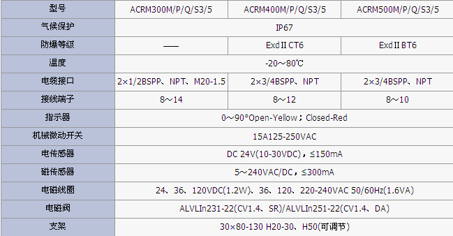 產(chǎn)品簡介:型號(hào)ACRM300M/P/Q/S3/5ACRM400M/P/Q/S3/5ACRM500M/P/Q/S3/5氣候保護(hù)IP67防爆等級(jí)&mdash...
